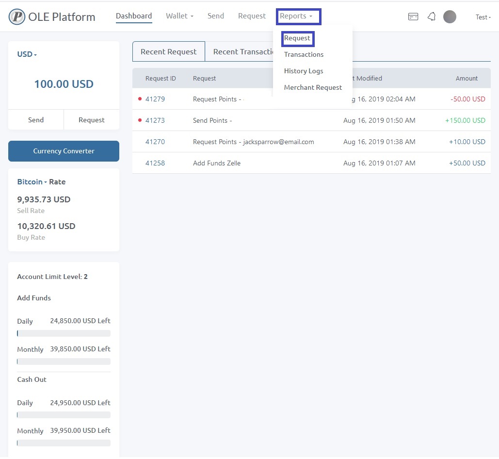 Option 2: You can click "Reports" which is located on the top of the screen, then you will need to click "Request".