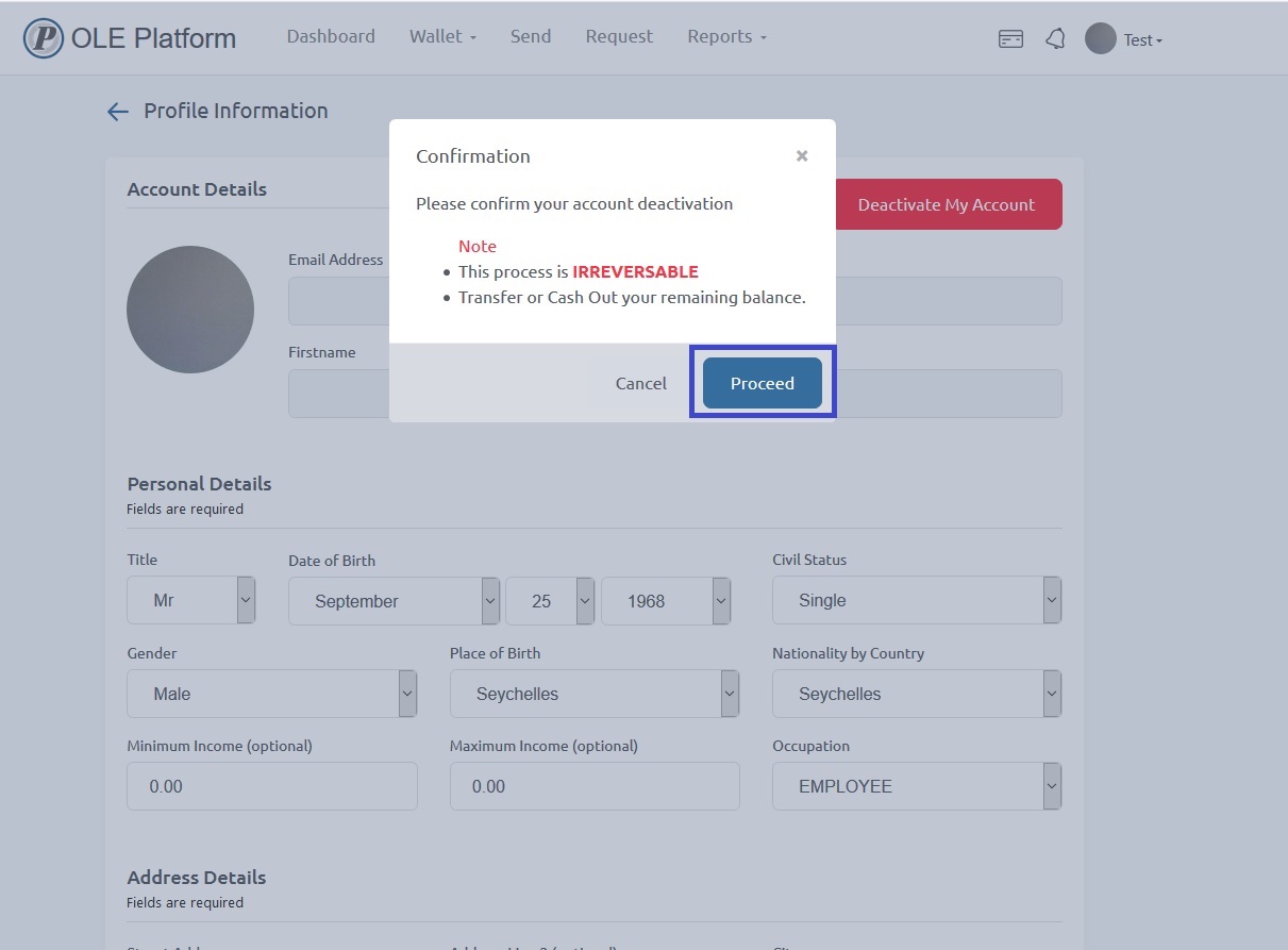 A pop up notification will come up inform you that the "action is irreversible" and if you still want to deactivate the account. You need to click proceed to deactivate the account. You need to ensure that you have no funds on the account otherwise you will not be able to deactivate the account.